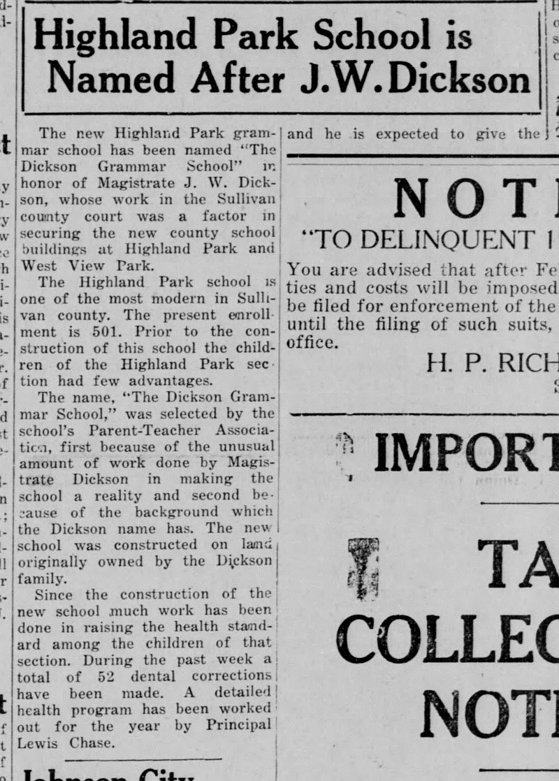But it was the P.T.A. meeting of February 1934 that brought the absolute surprise to the Dickson family. The P.T.A. voted that the name of the new modern school of Sullivan County Tennessee should be, by anonymous agreement, - DICKSON - In honor of the man who with singleness spent two years of his life in dedication to give the children of Sullivan County a place that could begin their leadership skills and character to be the next generation of American ….
